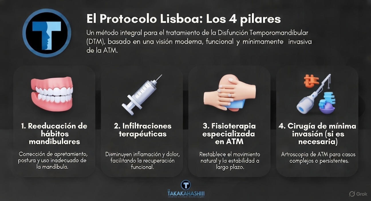 El Protocolo Lisboa es un método de tratamiento integral para la Disfunción Temporomandibular (DTM) basado en las enseñanzas del Dr. David Angelo (Portugal), pionero de una visión moderna, funcional y mínimamente invasiva del manejo de la articulación temporomandibular (ATM).